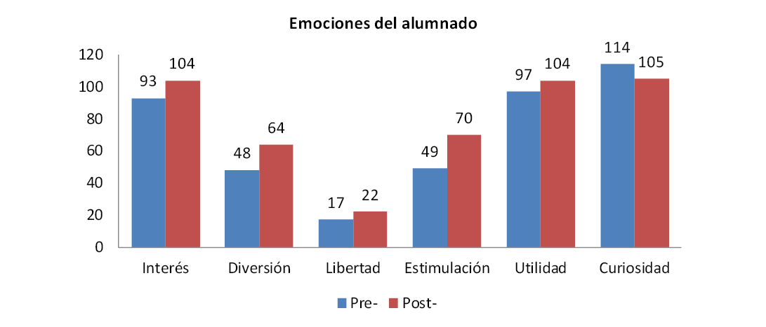 Las emociones que muestran entorno a la ciencia son muy diversas pero la gran mayoría son positivas calificándolo de divertida, estimulante e interesante. En relación a las palabras positivas que mejor definen la relación de los estudiantes con la ciencia, las que mejor representan estas sensaciones son: curiosidad, interés y utilidad. Tras la realización del proyecto los alumnos sienten la ciencia con mayor interés (104 frente a 93), más divertida (64 frente 48) y más útil (104 frente a 97), tal y como aparecen reflejados en el Gráfico 2. Sin embargo, parece que la curiosidad, tras la realización del proyecto no solo no aumenta, sino que disminuye (114 frente a 105), tal vez porque la implicación en este tipo de proyectos de alguna manera haya respondido o “saciado” su curiosidad entorno a qué es la ciencia y cómo se genera.