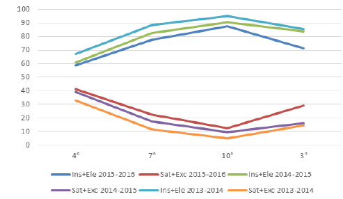 Gráfico 3.Niveles de logro por el ciclo escolar, según el grado evaluado (Ins= insuficiente; Ele = Elemental; Sat = Satisfactorio; Exc= excelente), según datos de INEVAL (2016, p. 101).