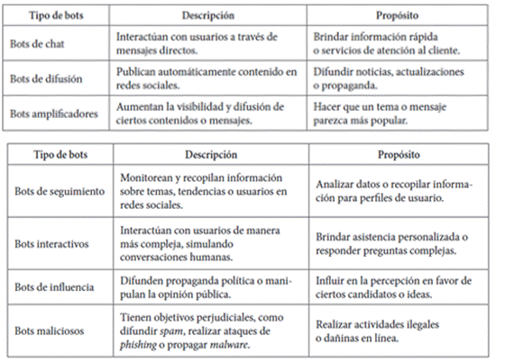 Tabla 1 . Tipos de bots en redes sociales y sus respectivos propósitos
