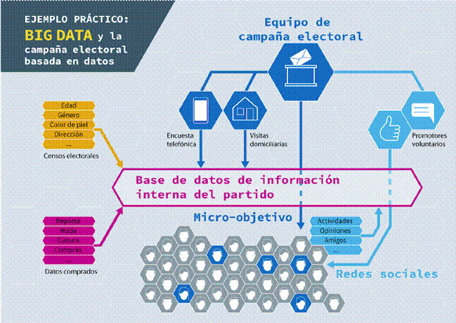 Uno de los casos más renombrados del uso de la big data en campañas políticas fue el de Barack Obama en EE. UU.; los datos fueron utilizados presuntamente para la elaboración de discursos y programas políticos (Méndez 2015). El objetivo era saber cómo votaría el electorado e influenciar a los indecisos. Las llamadas y los discursos se adaptaron a los votantes; asimismo, quienes sentían afinidad política podían donar por medio de la página web.