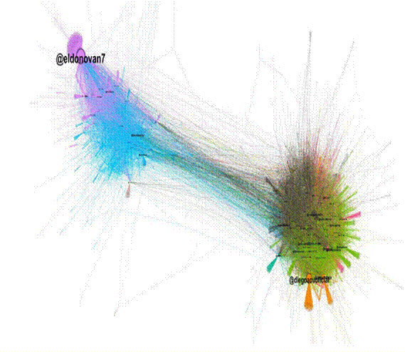 La figura […] recoge la campaña lanzada por la candidata a la presidencia de Perú, Keiko Fujimori, en rueda de prensa. Se observan dos grandes clústeres claramente polarizados: en el izquierdo, una sola comunidad burlándose o quejándose de la campaña por no haber pruebas de fraude; en el otro, vemos dos comunidades principales donde las cuentas que recibieron más RT están en la parte inferior, destacando el presentador de Willax TV, Diego Acuña.