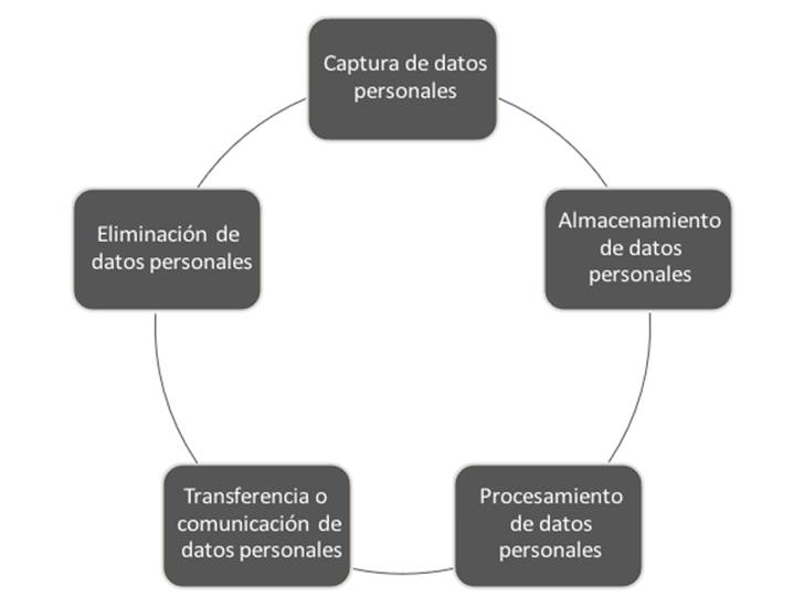 El ciclo de vida inicia con la captura de datos personales para después almacenarlos en repositorios físicos o digitales. Una vez almacenada la información, se realiza el procesamiento de los datos; por ejemplo, perfilamiento o analítica de datos. En algunos casos, se los transfiere o comunica a terceros externos. La última fase es la eliminación de la información.